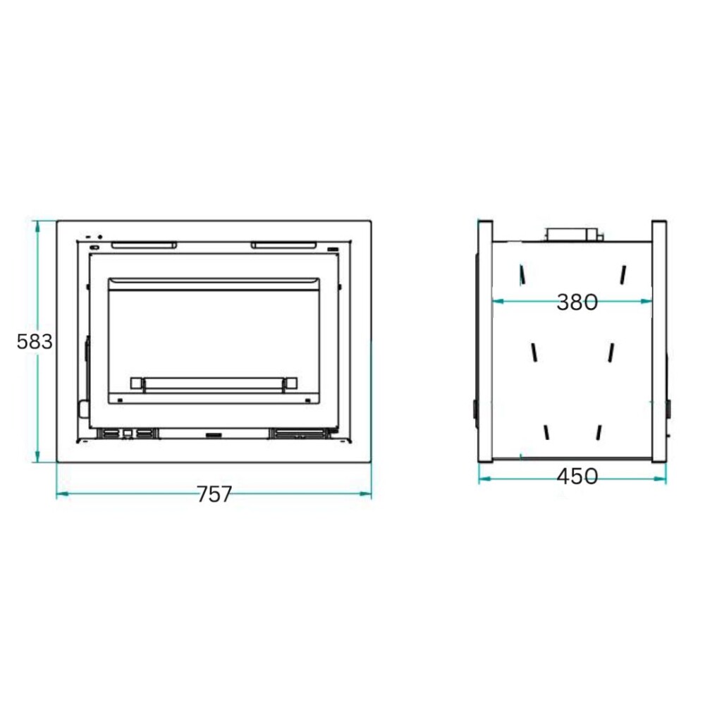 It runs on wood, which is renewable and sustainable, making it a good choice for the environment. It has a power output of 12.5 kW and can heat up to 111m², which is great for larger rooms or open-plan living areas. It has an efficiency rating of 73.5%, which means it can provide a lot of heat while using less fuel, saving you money. The fan in the insert helps to distribute heat evenly around the room, keeping you warm and comfortable. It's made of durable steel, so it will last for many years. The insert has a top flue outlet with a diameter of 150mm, which helps to vent smoke and fumes effectively. Overall, the Algora DF Double Sided Fireplace Fan Insert is a reliable and stylish way to keep your home cozy during the colder months.
