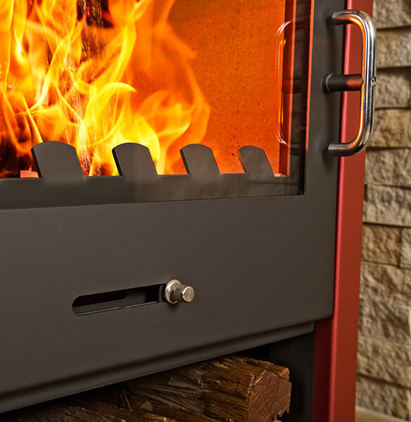 This designer, freestanding, boiler stove fireplace has distinctive Ruby Red side panels which command admiration and attention.