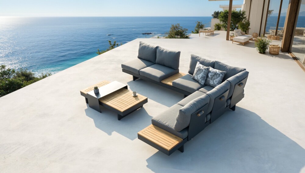 Durable Frame: Powder-coated anthracite aluminium with sleek teak wood and aluminium table tops