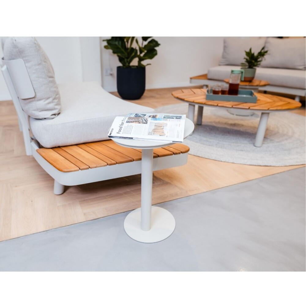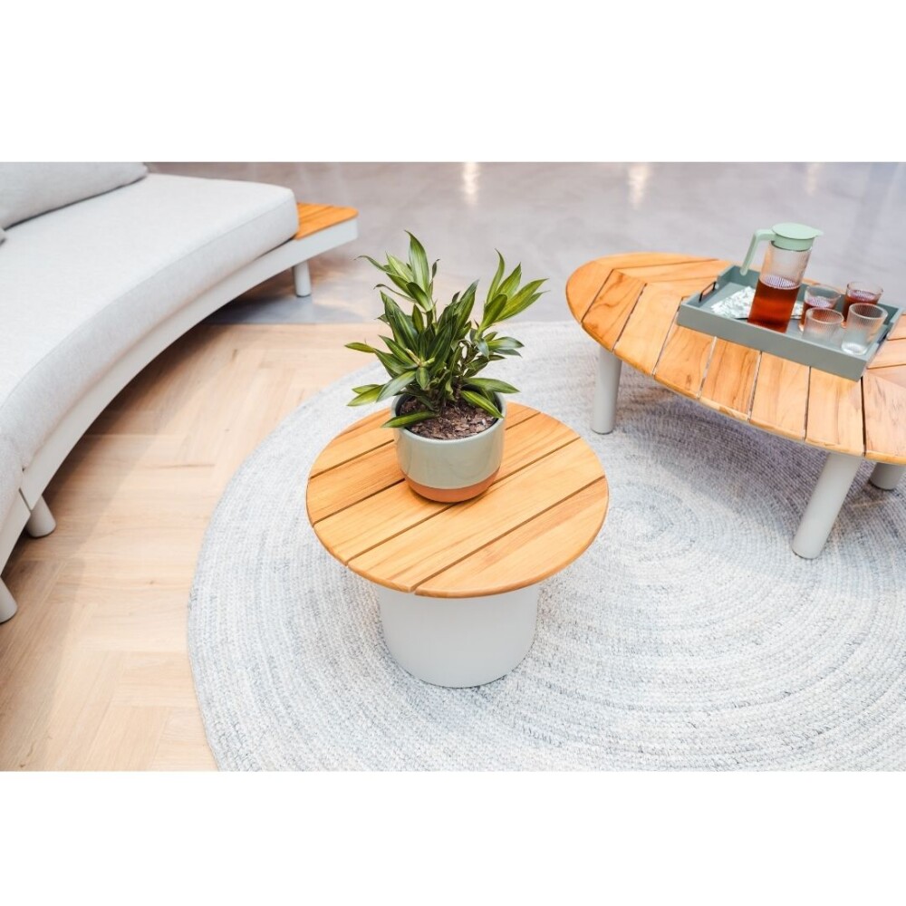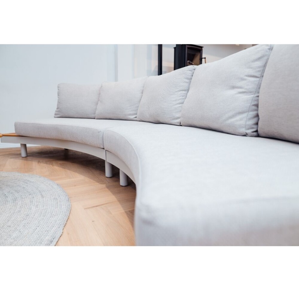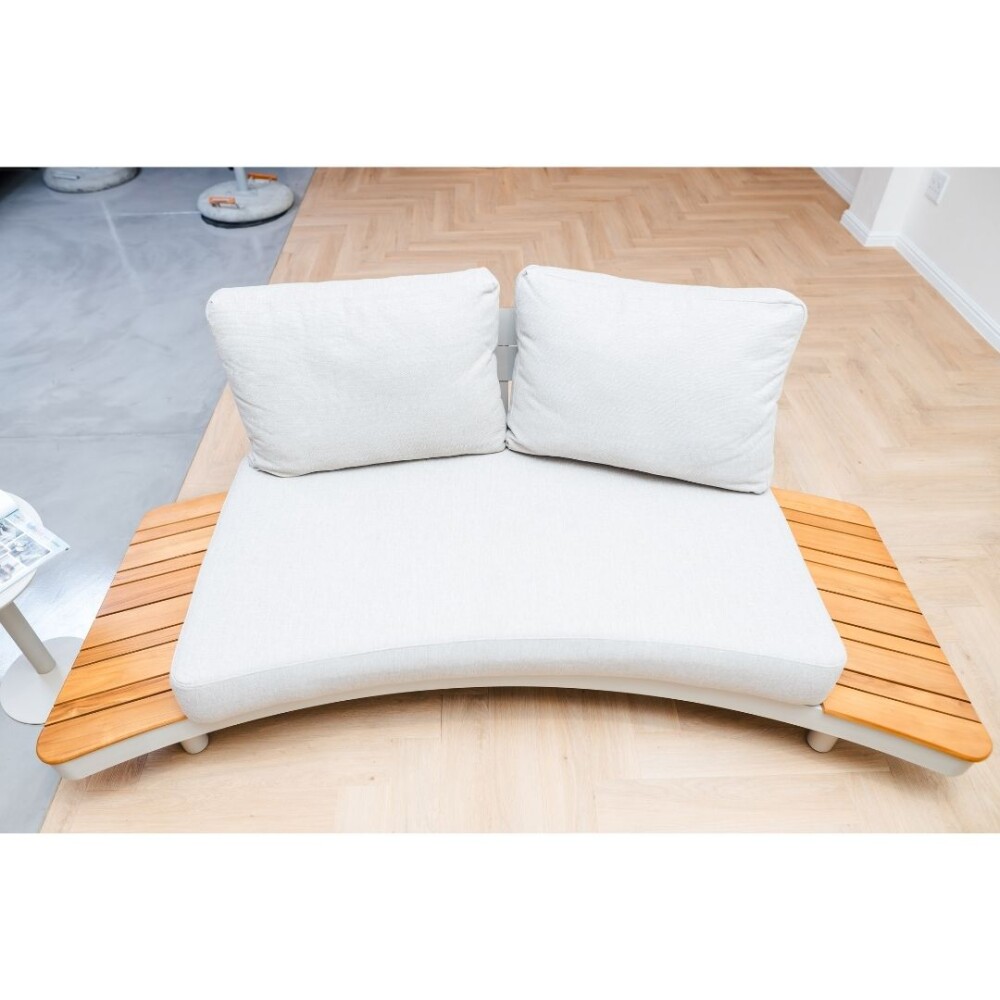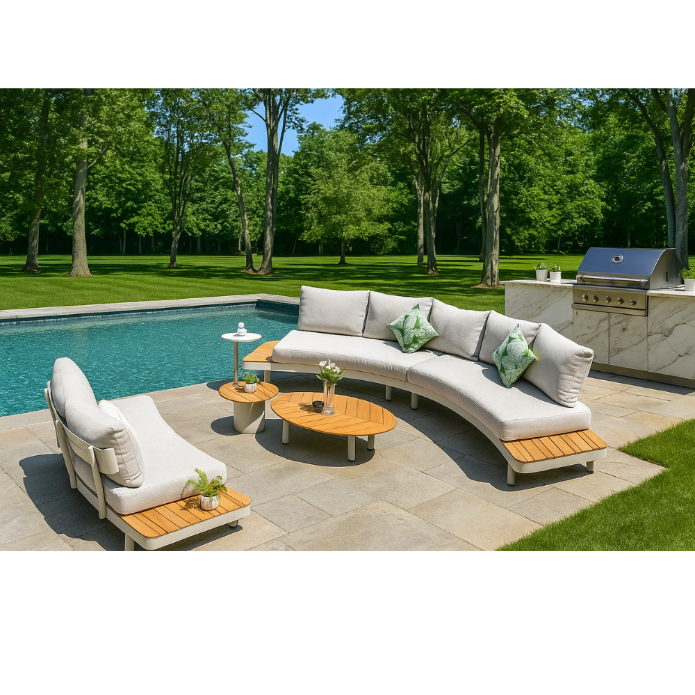 Modern 6-piece curved outdoor sofa set crafted in aluminium with natural teak accents. Plush, weather-resistant cushions for all-day lounging.