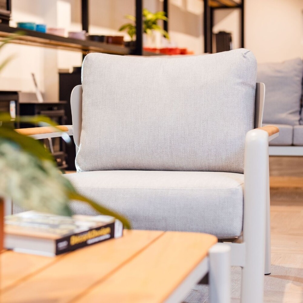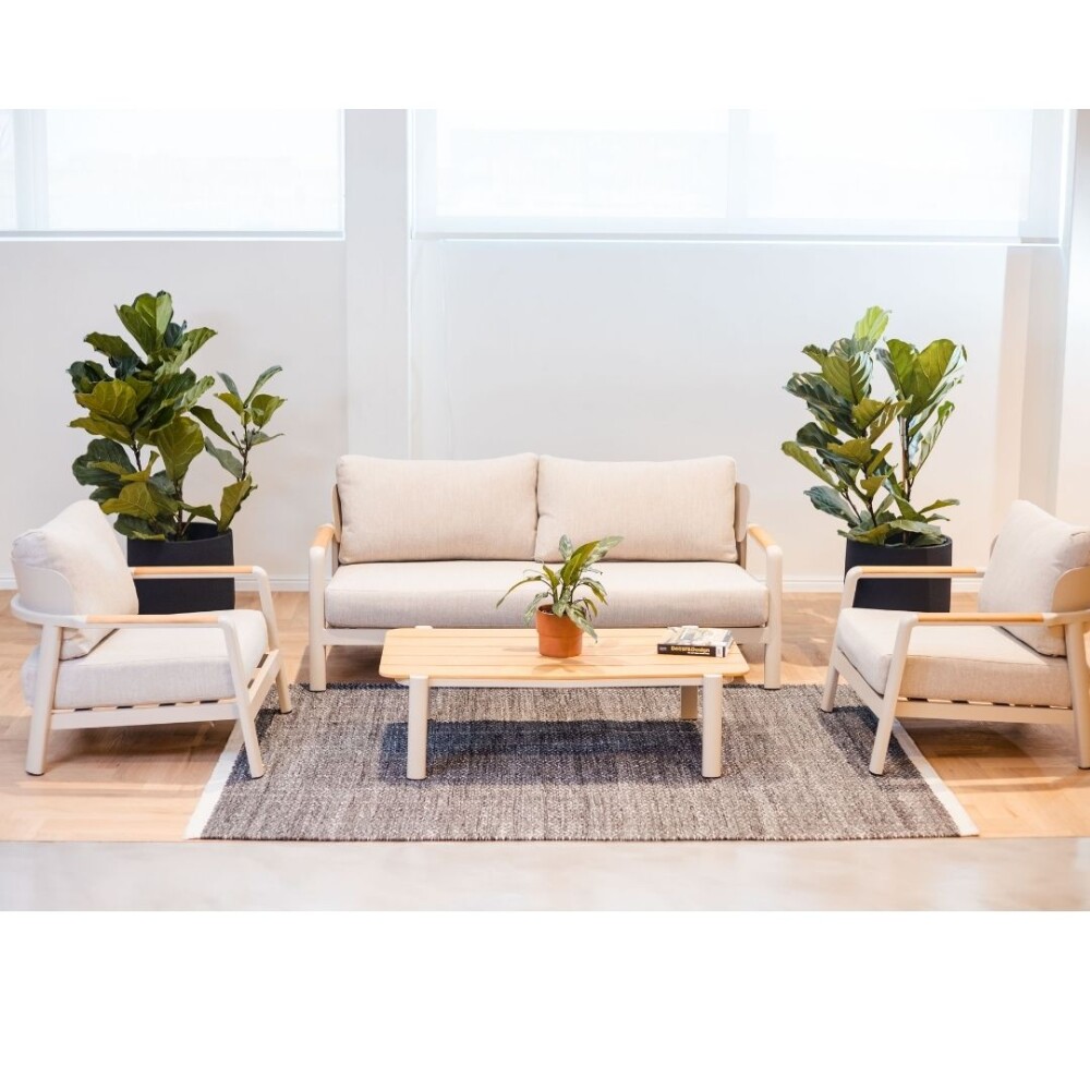 Ravello Teak Charm Set Designed for relaxed elegance, this contemporary outdoor lounge set pairs a sleek white aluminium frame with warm teak armrests and tabletop—perfect for stylish gatherings or quiet moments in the sun.