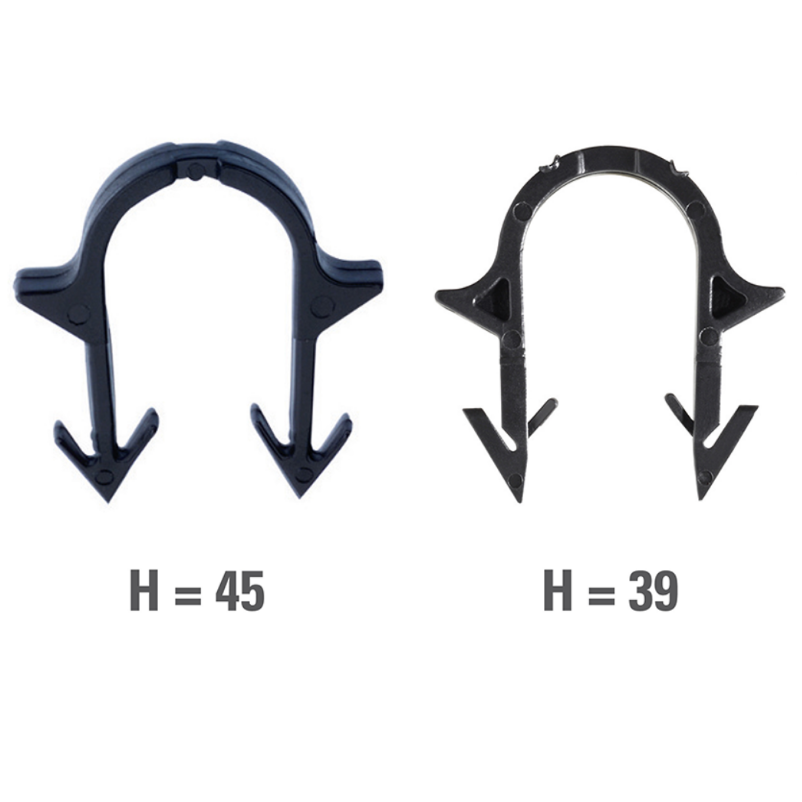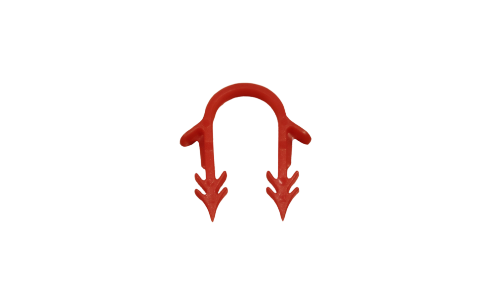 Single hook clips used for securing underfloor heating pipework to the insulation boarding before the screeding process, in traditional underfloor heating installations. The clips come in 25-unit strips that are loaded into tacker guns, allowing for an easy and effective pipe-securing method.