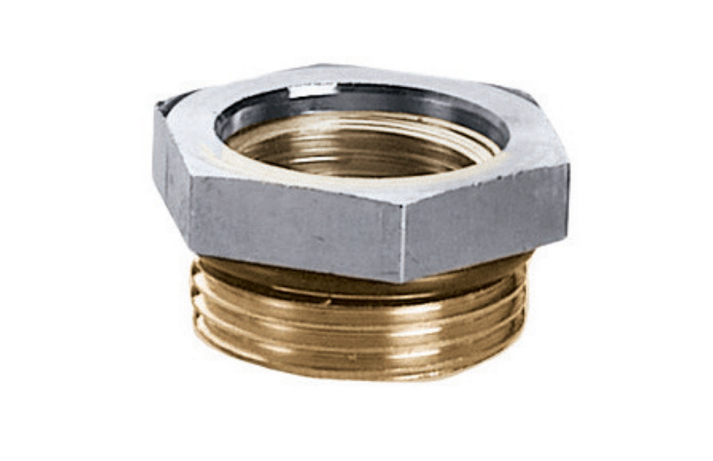 A nickel plated,3/4" male to 1/2" female reducing fitting
