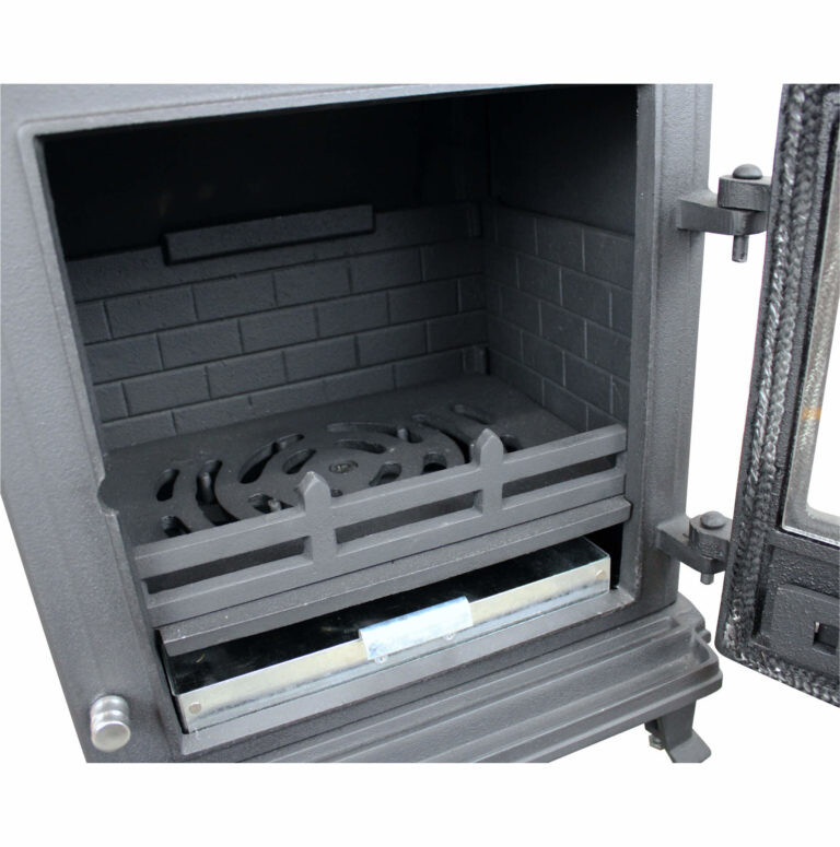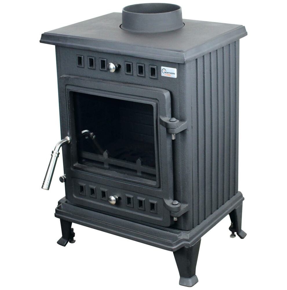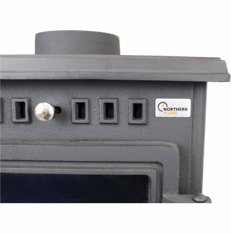 The Northern Flame Logi is a small, cheerful, multi fuel fireplace manufactured out of pure, Australian mineral iron ore. The cast iron is top quality and durable and is not produced from recycled or excess materials. It features a cast iron door, body and a thick, cast-iron top which radiates heat long after the fire has dimmed down. There is a polished chrome handle and air control fittings. Heating a kettle of water is made easy on its cast iron flat top. This is very useful with our current power cuts. The Logi will fit into most fireplace hearths. There is Primary and Secondary Combustion with air controls. Primary air enters via the air vent at the bottom of the door and feeds the fire from under the grate. Secondary air enters via the air vent above the door and is used for Secondary combustion and for the pre-heated air wash system that keeps the glass cleaner for longer. The Logi also has an excellent overnight burn system. Its airtight door gaskets and manually controlled air vents allow you to close the stove down overnight. All you need to do is reopen the air controls, add fuel, and watch the fire roar again in the morning. The combustion chamber is lined with cast-iron firebricks and comfortably loads 30cm logs. There are heat resistant fire rope seals on the door, a removable cast iron baffle plate, and a cast iron, multi-fuel ash riddling grate. The ash pan is removable for an easy clean. Included is an ash pan tool for ash pan removal; a glove for opening the door and adjusting the air levers; and an instruction manual. The legs of the Logi are removable. The Logi is a high-end product manufactured to European design, in China, for the U.K. market. It is CE and British Standard EN approved and comes with a 5-year limited warranty.