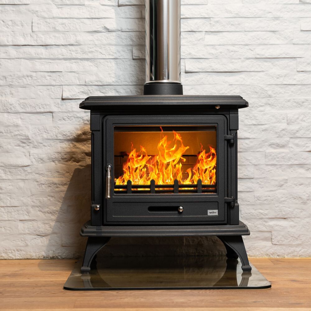 Inside, the combustion chamber is lined with cast-iron plates. The door features heat-resistant fire rope seals, a removable baffle plate, and a versatile cast iron multi-fuel ash riddling grate. Clean-up is a breeze with a removable ash pan.